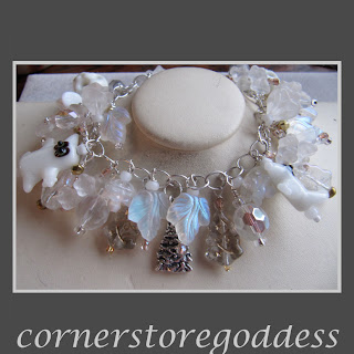 A bracelet of sterling silver, with a sterling silver Christmas tree charm, lampwork glass ghosts and skulls, flowers, trees and Christmas bells of pressed glass and crystal, each wire wrapped with sterling silver wire. The bracelet has an inside diameter of approximately 7".